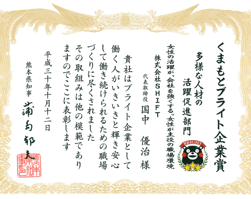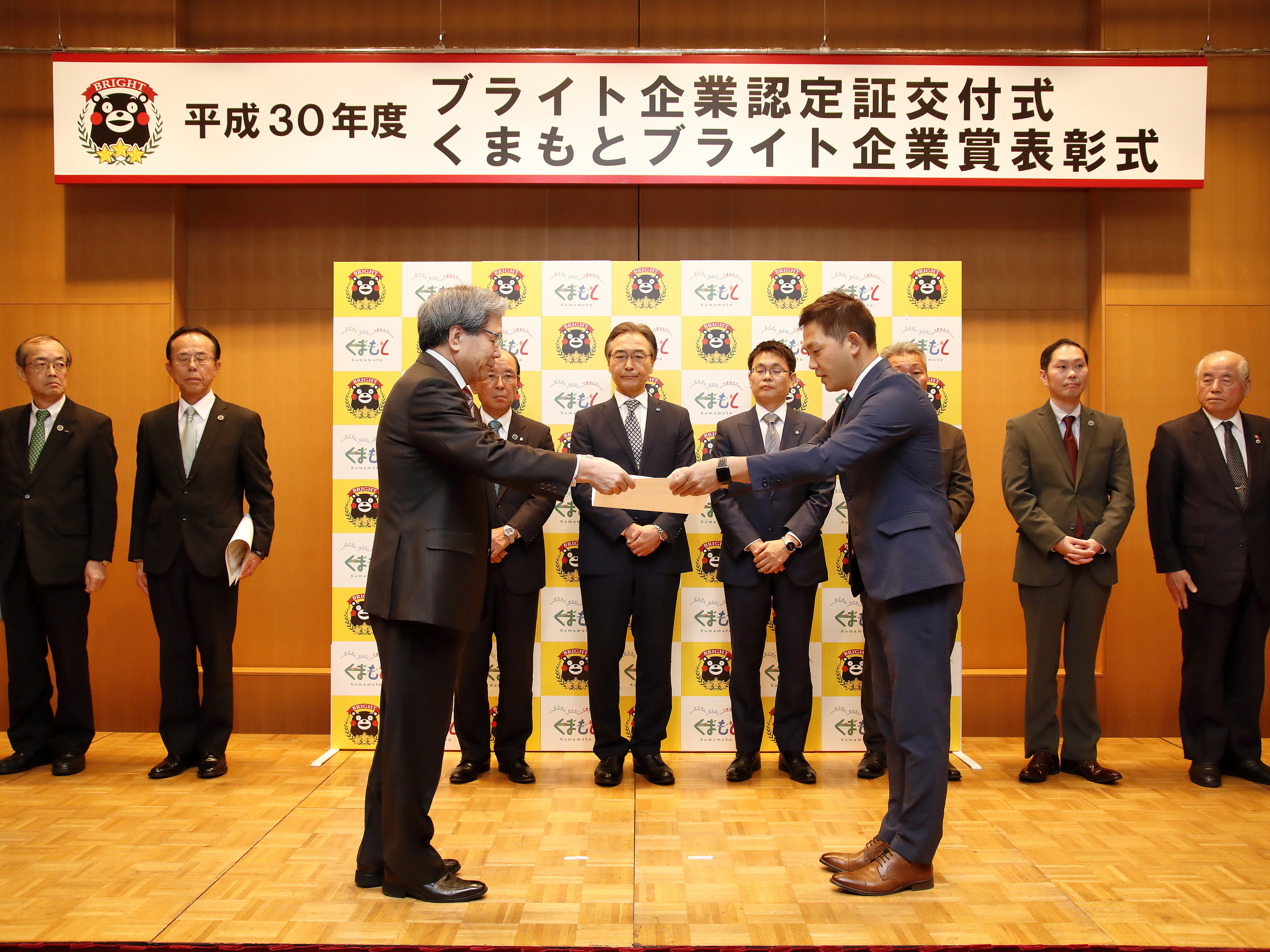 「くまもとブライト企業賞」とは、ブライト企業が実施している労働環境や処遇向上などの活動の中でも特に優れた取り組みを表彰する賞です。