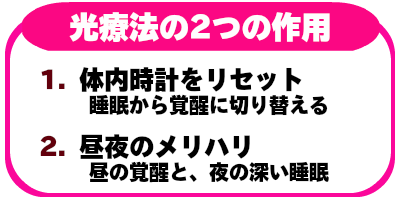 しかし、実際に毎朝太陽の光を長時間浴びることは難しく、そこで有効となるのが「光療法」です。人工的に光の照射を行い、生体リズムを整えてくれるのです。